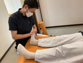 足首の関節がゆがんで動きが悪くなっていたのと、足首にうまく力が伝わらず背屈力(つま先を上に上げる)が著しく低下しているために膝周りの筋肉が頑張りすぎて痛みがなかなか改善しなかったのです。