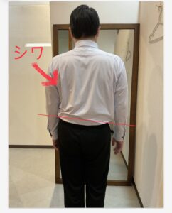 服のシワも左に多くありますね。